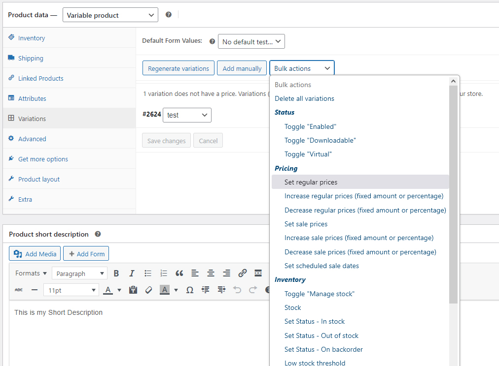 • If all variations have the same price, you can use Bulk Actions > Set Regular Price to save time.